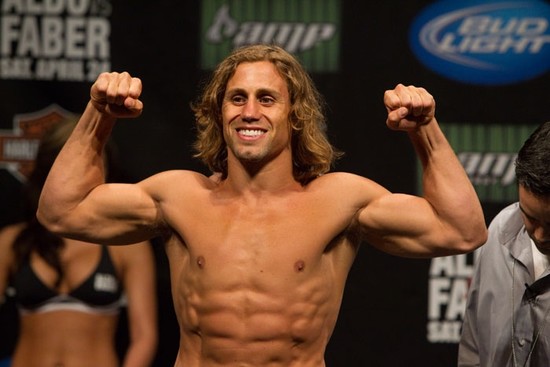 Now here's Urijah Faber, who's also 5'6, weighing in at the exact same 135 lb. limit and giving his own half-assed flex. You can tell because his biceps are fairly relaxed, and not jumping upwards like when you really put some literal muscle into it.